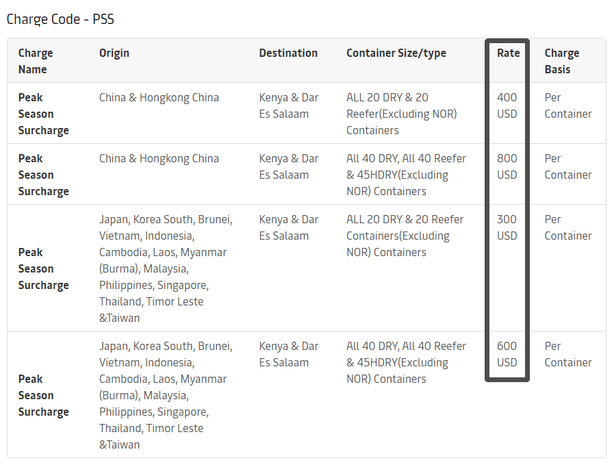 2025年1月1日实施旺季附加费PSS,范围:中国,中国香港,日本,韩国,文莱,越南,印度尼西亚,柬埔寨,老挝,缅甸,马来西亚,菲律宾,新加坡,泰国,东帝汶、中国台湾到肯尼亚、达累斯萨拉姆。