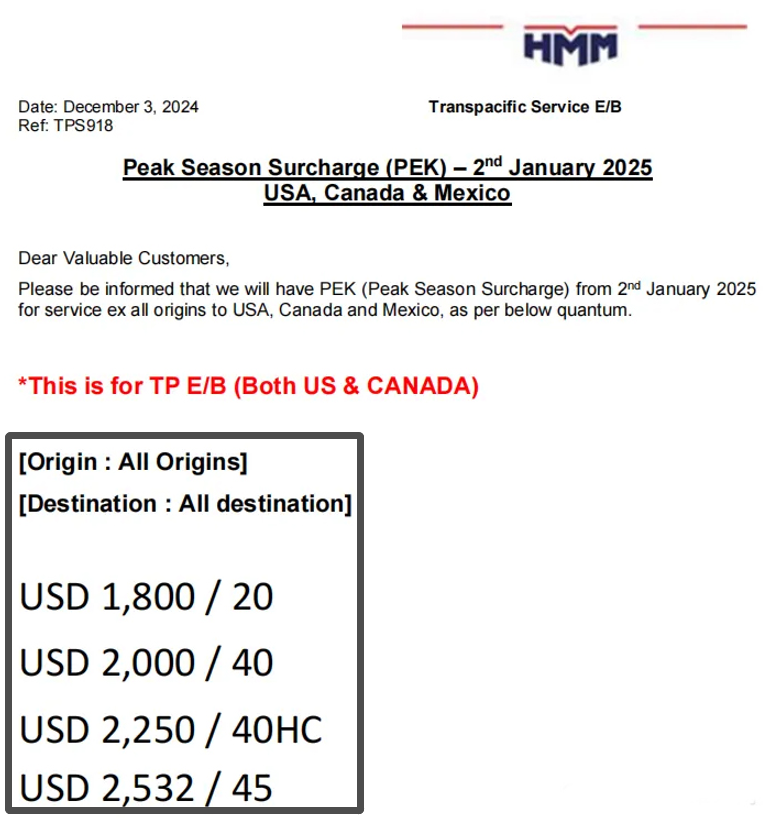 HMM征收所有出发地到美国、加拿大和墨西哥的旺季附加费
